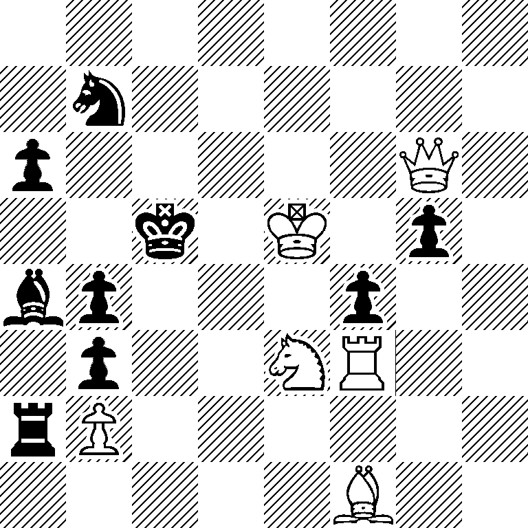 The result of some joint composing on the fringes of the Hastings Chess Congress of 1993-1994.