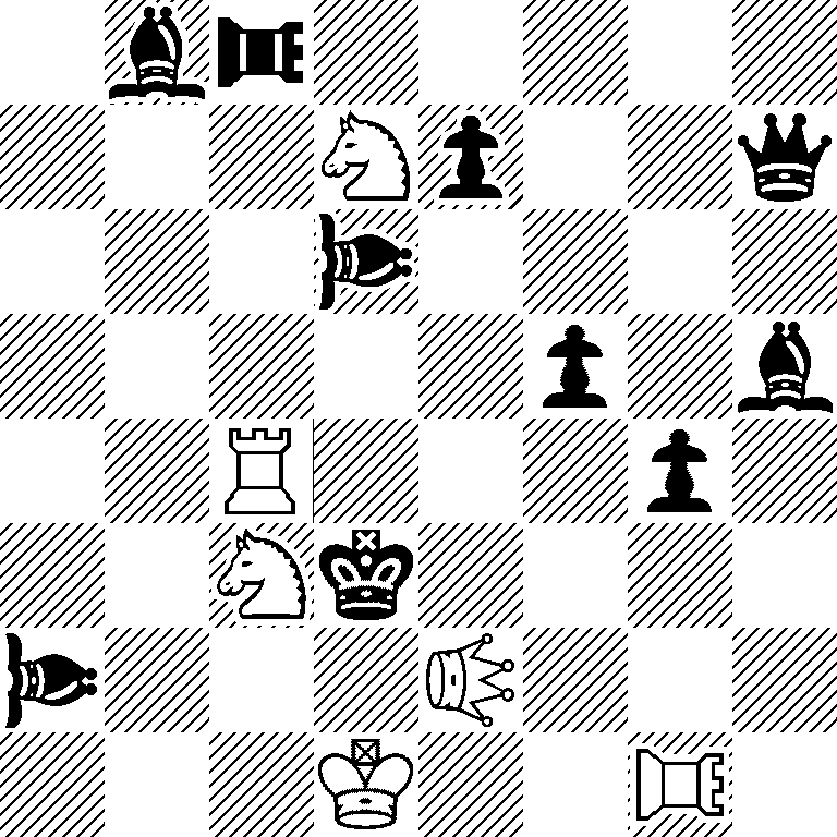 The wSIe2 guards the wRc4 before the threat as b5 is empty and after the threat as c5 is empty. Black can stop the threat by moving to c5. 1...TRc5 interferes with the bNDd6 and 1...NDc5 unguards c5 by occupying it. The next three variastions show three more interferences with the bNDd6. 1...g3 pins the wSI, but, with g3 now occupied f4 is unguarded for 2.Sf4#. 1...f4 threatens 2...Qd4 after the threat, but unguards e5 for 2.Se5#. 1...e5 threatens to play 2...e4 after the threat, but allows 2.TRg3. Black interferes with the bNDd6 in four different ways, three of them on the one line.