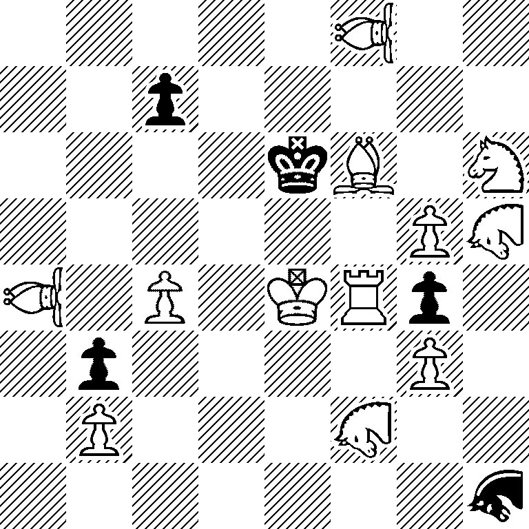 d7 is guarded by wNAh5 over wBf6 and d6 is guarded by wNAf2 over wKe4. 1...c6 puts another guard on d7, allowing White to play 2.Bd8 and then mate with 3.Rf6, re-imposing the wNAh5’s guard of d7. 1...c5 puts another guard on d6, allowing White to play 2.Ke3 and then mate with 3.Re4, re-imposing the wNAf2’s guard of d6. These two variations show a theme I have called CHANGE OF HURDLE. I was very happy when I noticed that the construction allows the try 1.VAa3?, which is refuted by 1...c5!, as, after 2.Ke3?, Black is stalemated. At least one solver fell for this.