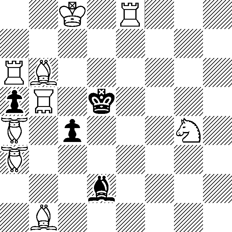 1.Ba2! () 1...c3 2.Re4# 1...Bg5 2.Sf6# 1...Bf4 2.Se3# 1...Bb4 2.Bc5# 1...Bc3 2.Rd8#